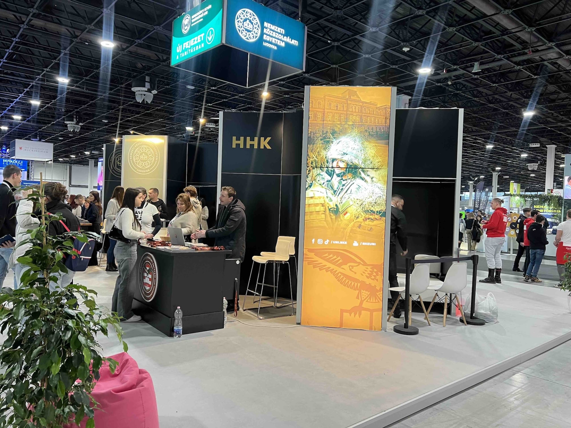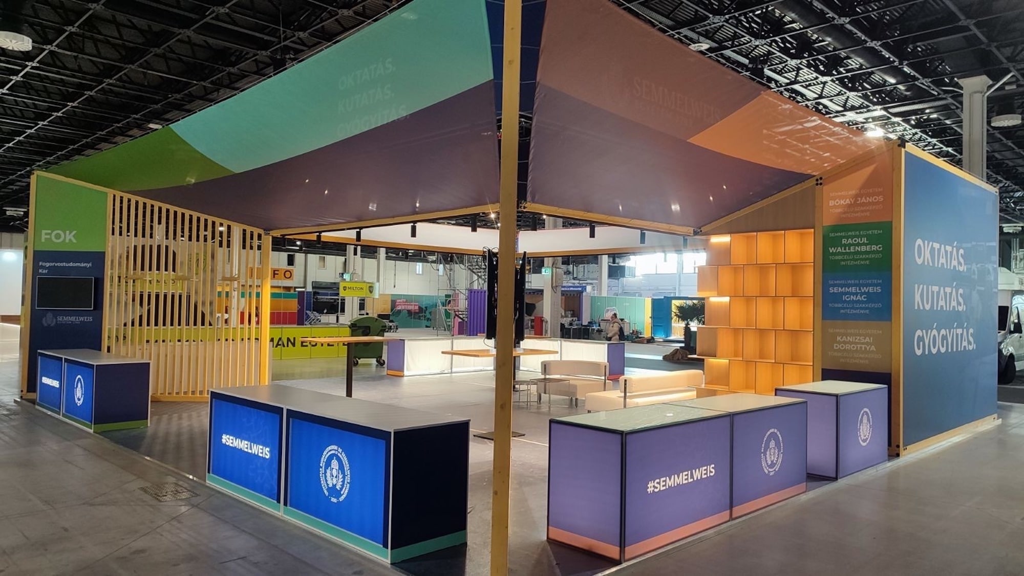 A Semmelweis Egyetem számára egy többször használható 144 m2-es egyedi standot terveztünk, ami először a 2023-as EDUCATIO Kiállításon került megépítésre a Hungexpo területén. A koncepció egy otthonos, meleg hangulatot árasztó stand megalkotása volt, aminél a fa használatát részesítettük előnyben.