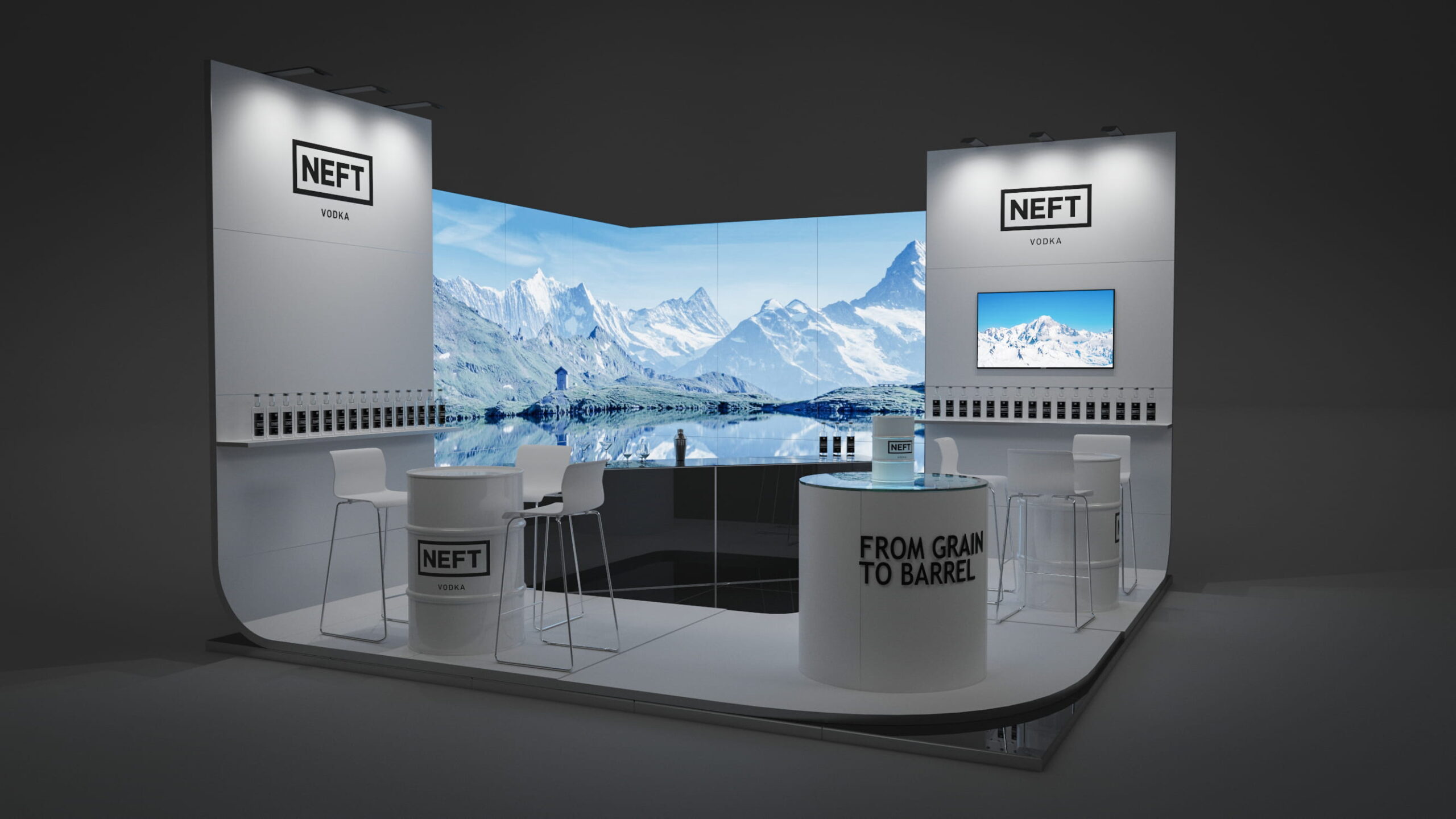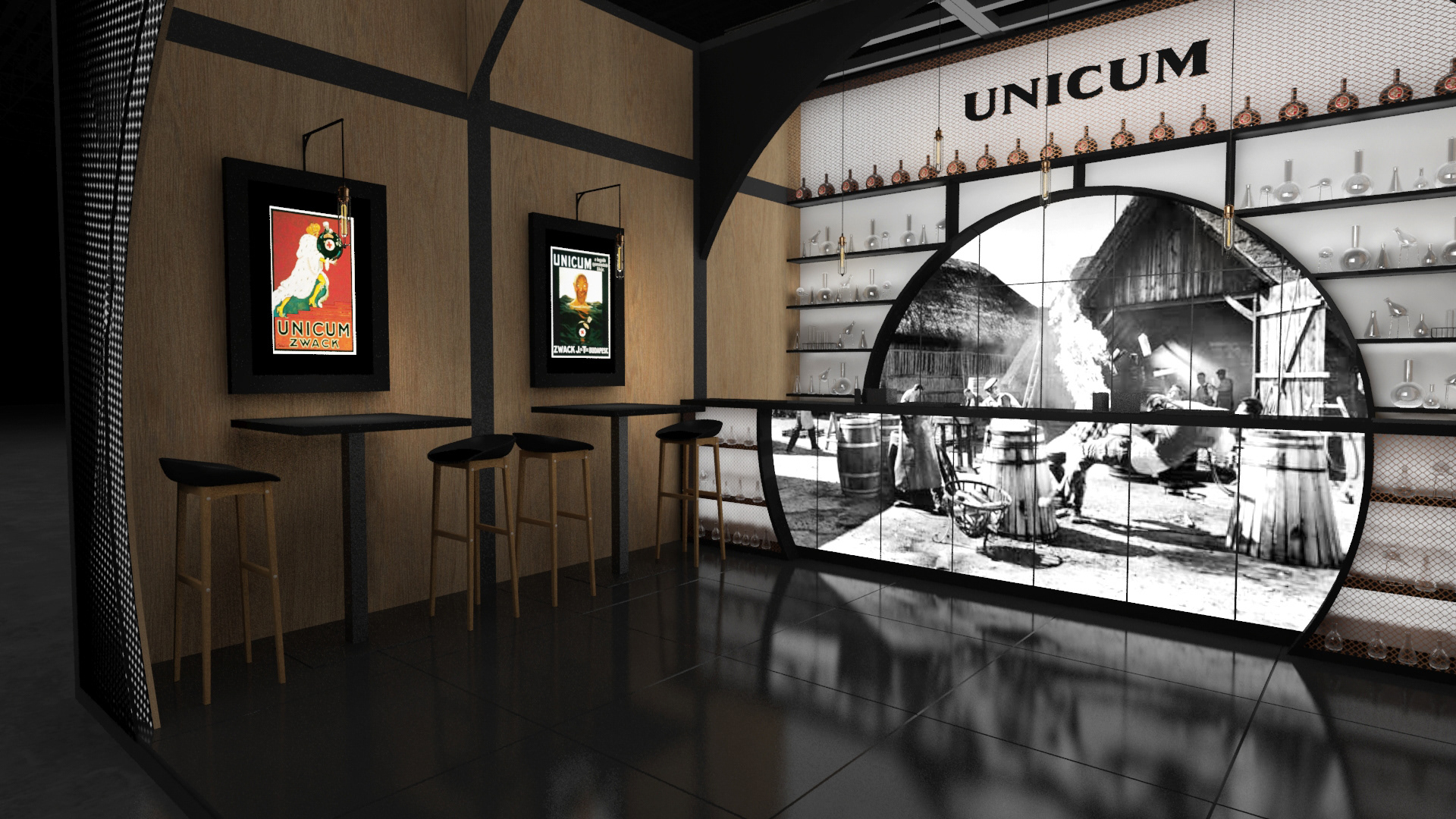 A 2018-as berlini Bar Convent kiállításra két demonstratív, konceptuális javaslatot készítettünk, amelyek az Unicum márka vizuális identitására és a több mint 200 éves vállalat örökségére épülnek. Ezt a koncepciót az Unicum ikonikus gömb alakú palackja ihlette. A vállalat régi gyárának anyagai ihlették a belső tér és design kialakítását.