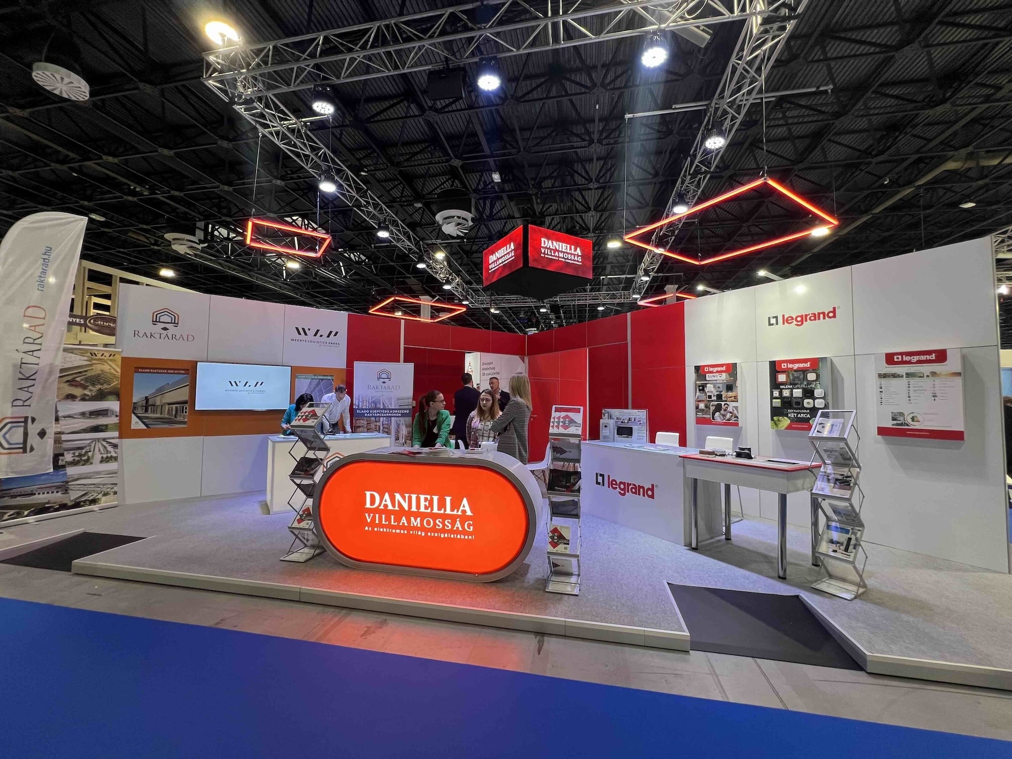 2024-ben a CONSTRUMA Kiállításon moduláris raktárkészletről elérhető elemekből terveztük és építettük fel a Daniella 160 m2-es standját a Szénási Event megbízásából.