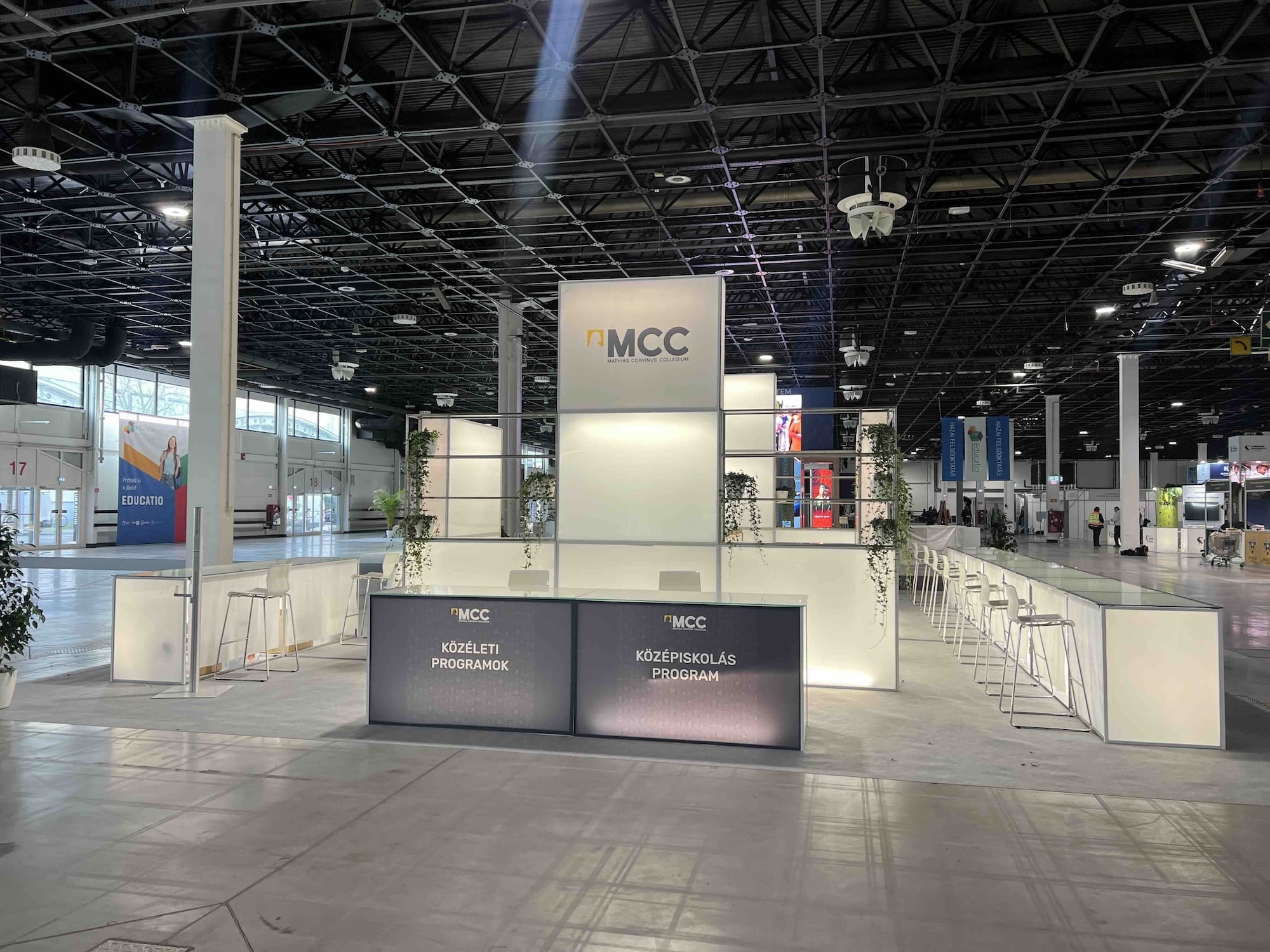A 2025-ös EDUCATIO Kiállításra az MCC megbízásából egy 120 nm-es stand tervezése és kivitelezése volt a feladatunk. A stand teret adott annak, hogy a Kollégium minden képzése bemutatkozhasson, sőt egy könyvtár hangulatú kávézó is helyet kapott benne.