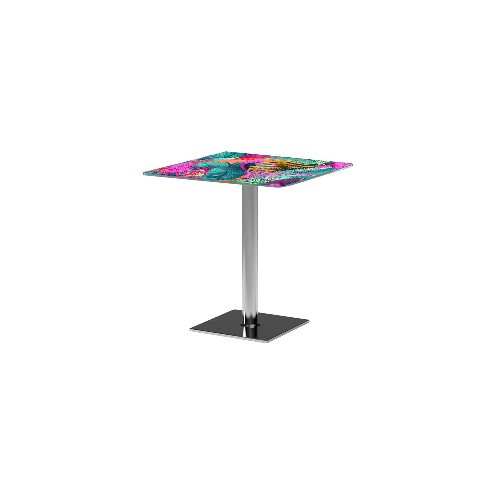 A króm talp és a brandingelhető üveglap kombinációja letisztult megjelenést nyújt. A láb egyedi gyártással további színekben is elérhető. A METALLIC MOTION, a BOUTIQUE BAROQUE és a SOFT HUG kollekciónk tagja. Beltérre és kültérre ajánljuk.