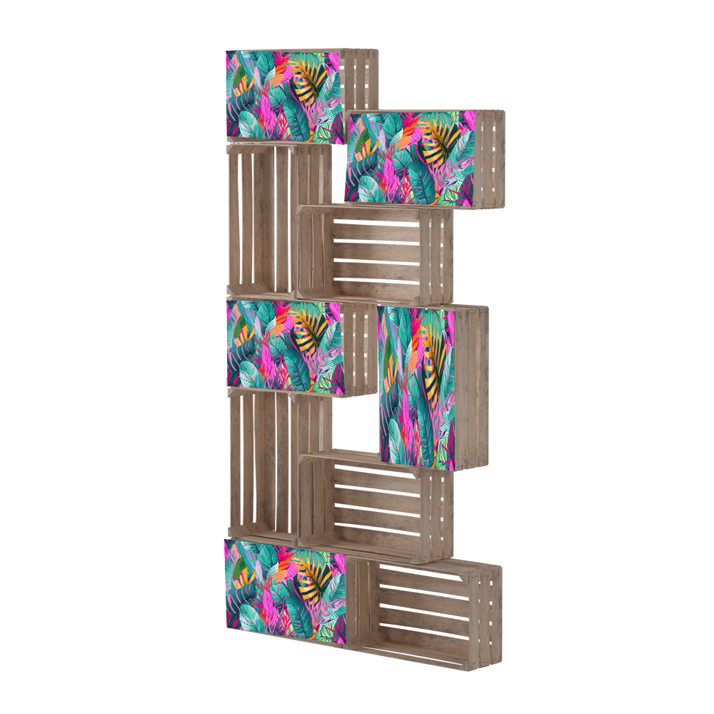 Termékkihelyezésre is alkalmas térelválasztó. Rekeszes polcelemei növényekkel és további apró tárgyakkal látványosan dekorálható. Felülete egyedi grafikával és stencillel a kívánt arculatra szabható. Beltérre és kültérre ajánljuk.