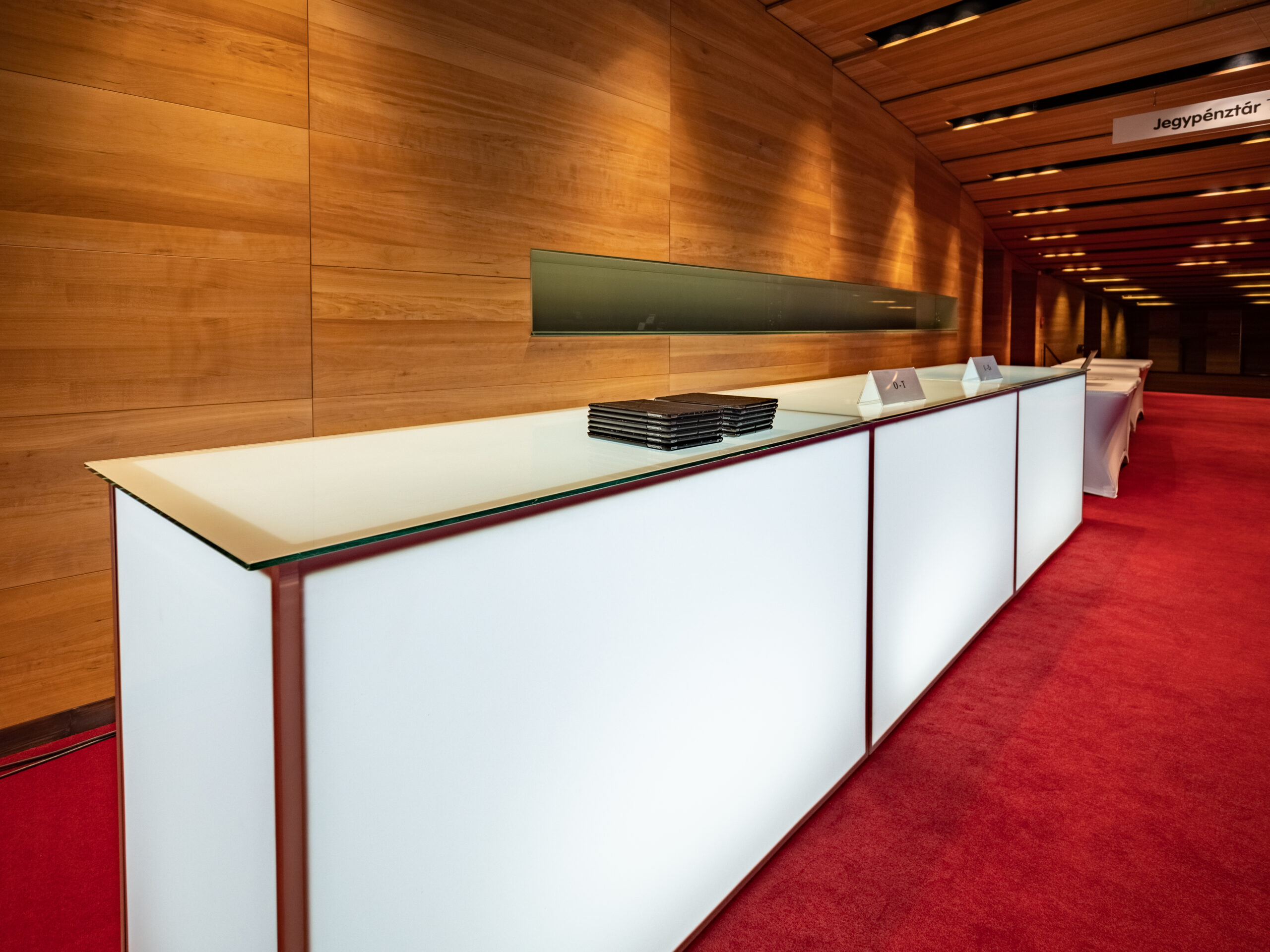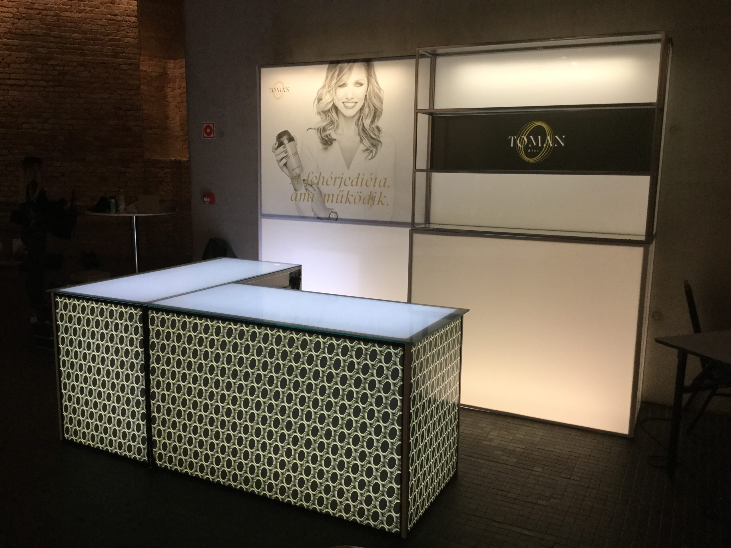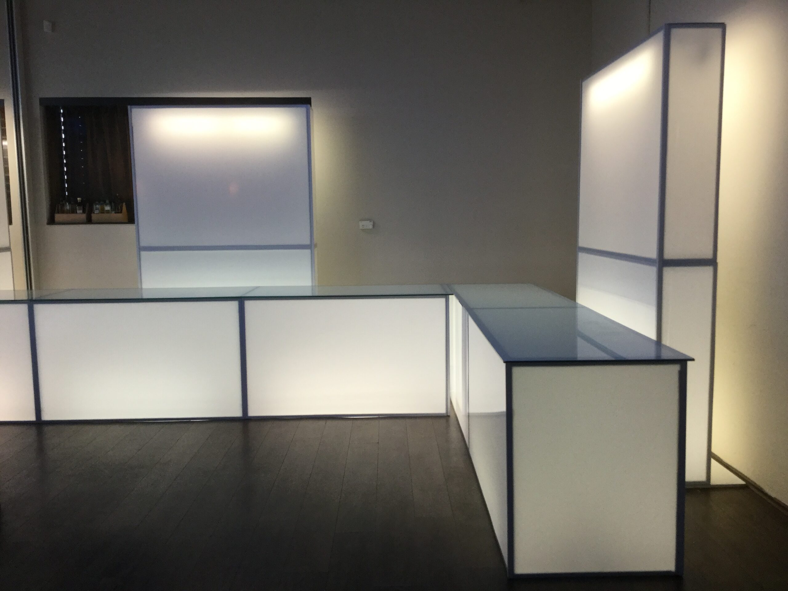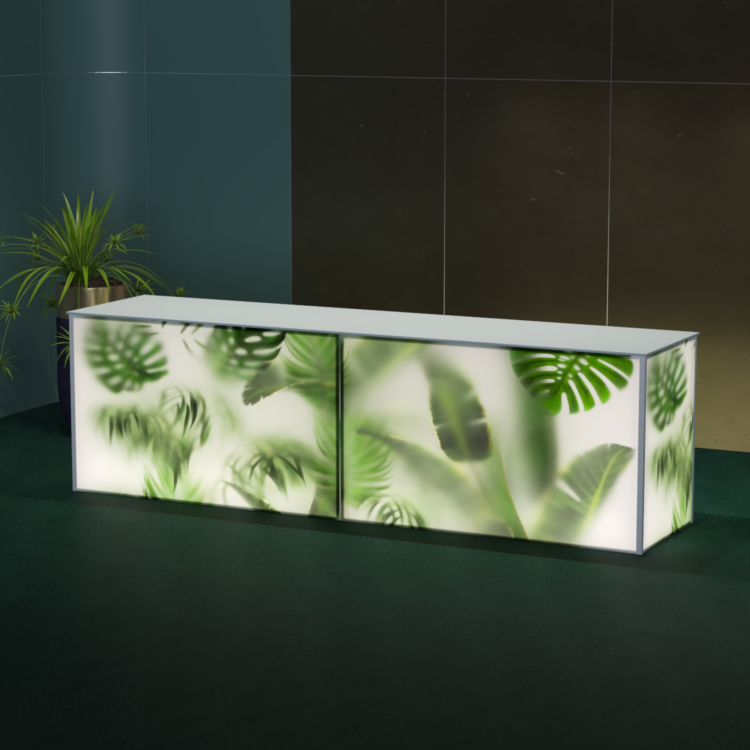 Világító plexi pultunk üveg, tölgyfa és tükör munkafelülettel is bérelhető. Teljes felülete színes fólia nyomtatással brandingelhető. Stílus kollekció burkolataink egyedi és merész megjelenést kölcsönöznek. Sorolható kialakításának köszönhetően számtalan elrendezés kialakítható. 1 méteres szélességben (RAY 90 S) is elérhető. Beltérre és kültérre ajánljuk.