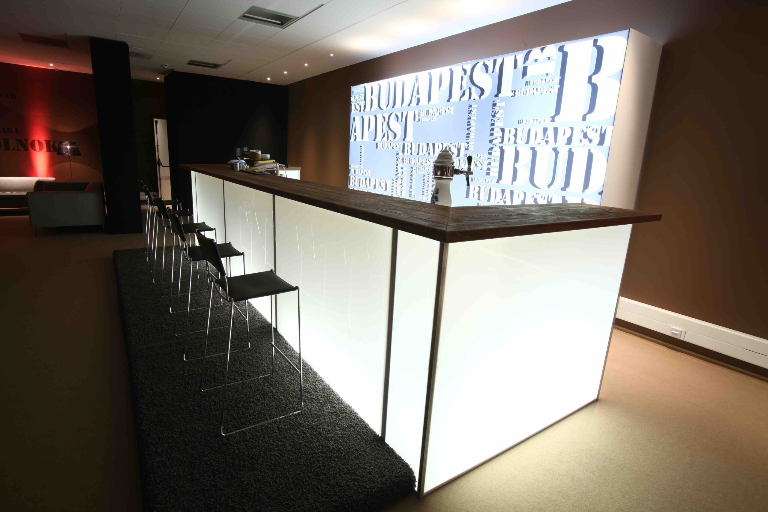 Világító bárpultunk üveg és tölgy lappal is elérhető. Látványosan brandingelhető 4C print fólianyomással, a tejfehér plexi egyedi kérés esetén, többféle színfóliával fényelhető. Lehetőség van egy standard méretű, 80 cm magas hűtő beépítésére. Többféle méretben elérhető. Beltérre ajánljuk.