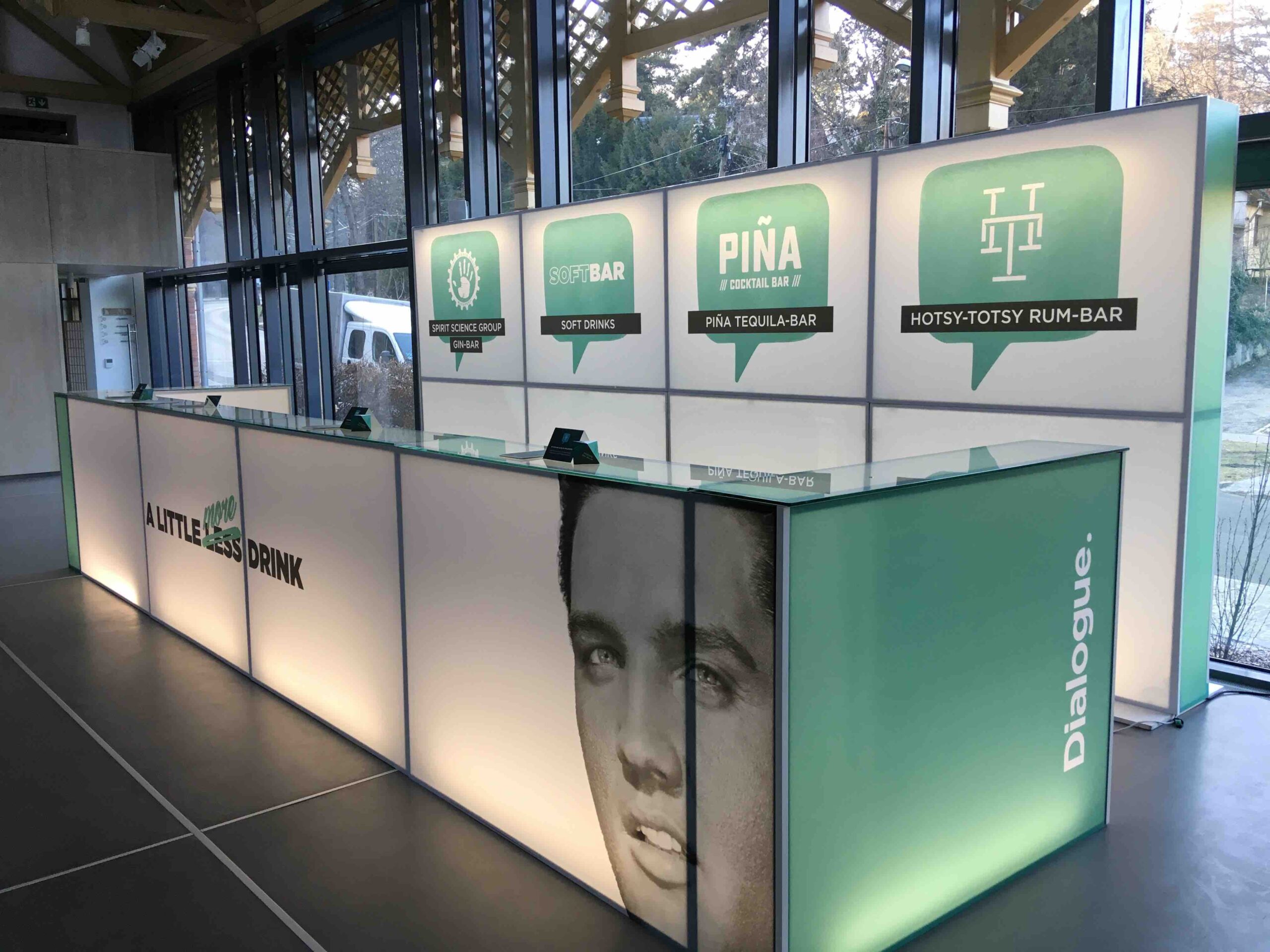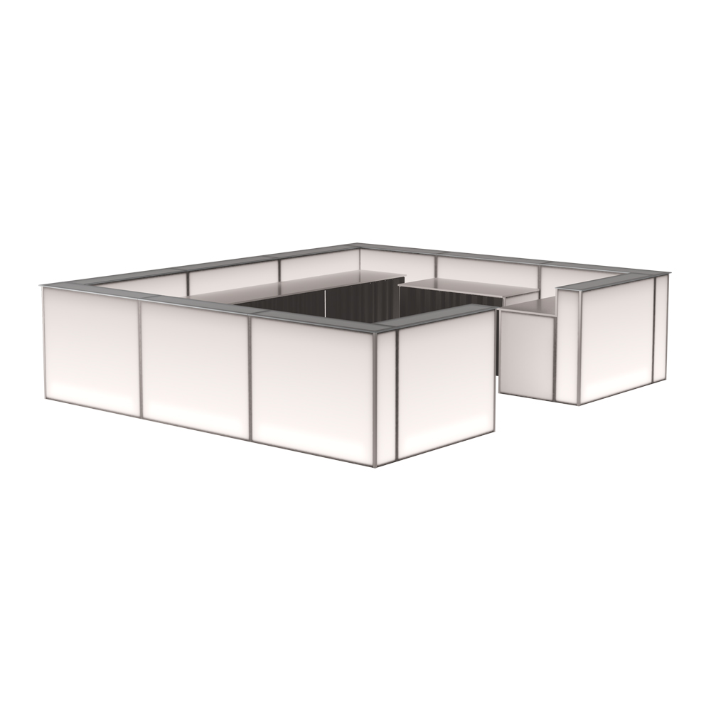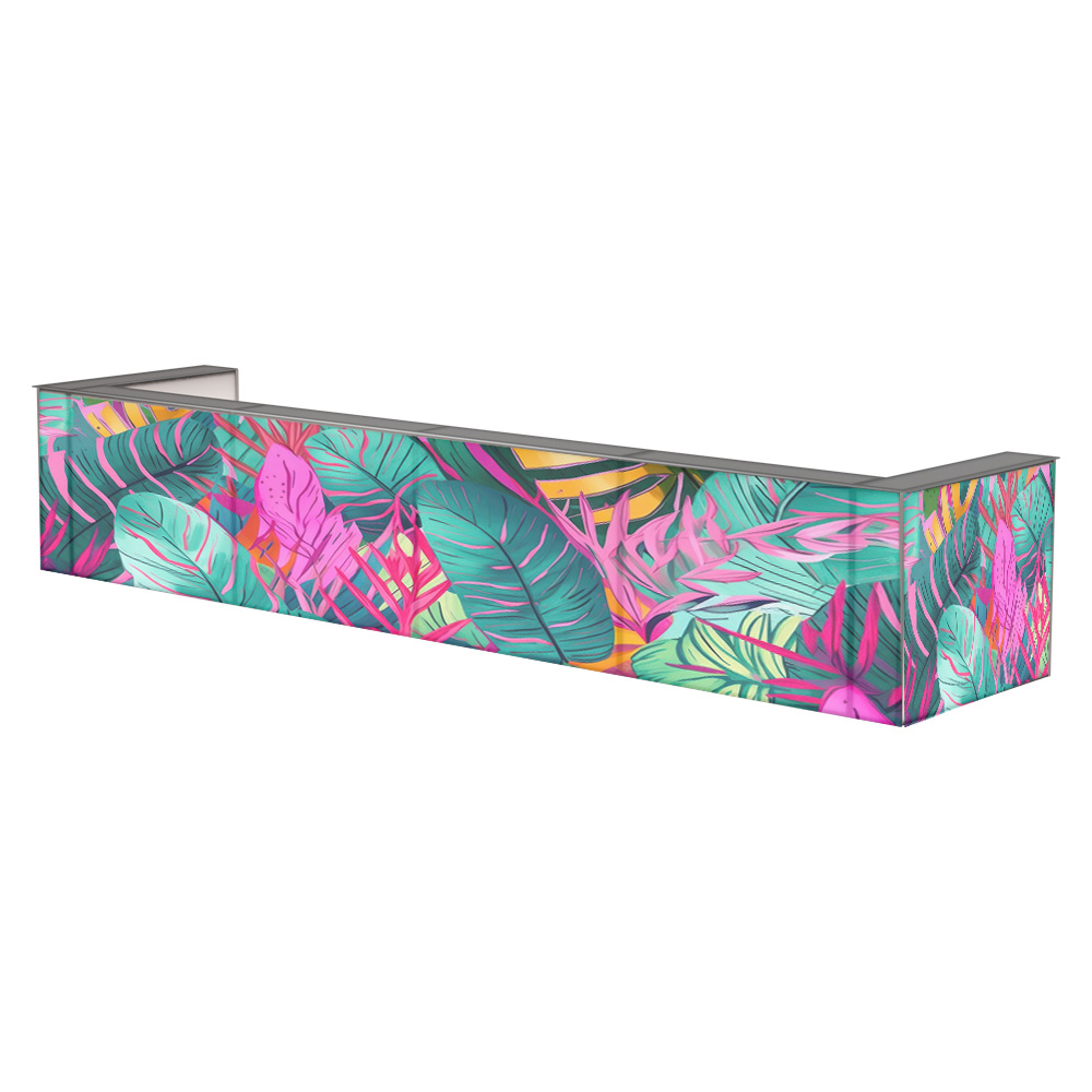 Világító bárpultunk üveg lappal elérhető. Látványosan brandingelhető 4C print fólianyomással, a tejfehér plexi egyedi kérés esetén, többféle színfóliával fényelhető. Lehetőség van egy standard méretű, 80 cm magas hűtő beépítésére. Többféle méretben elérhető. Beltérre ajánljuk.