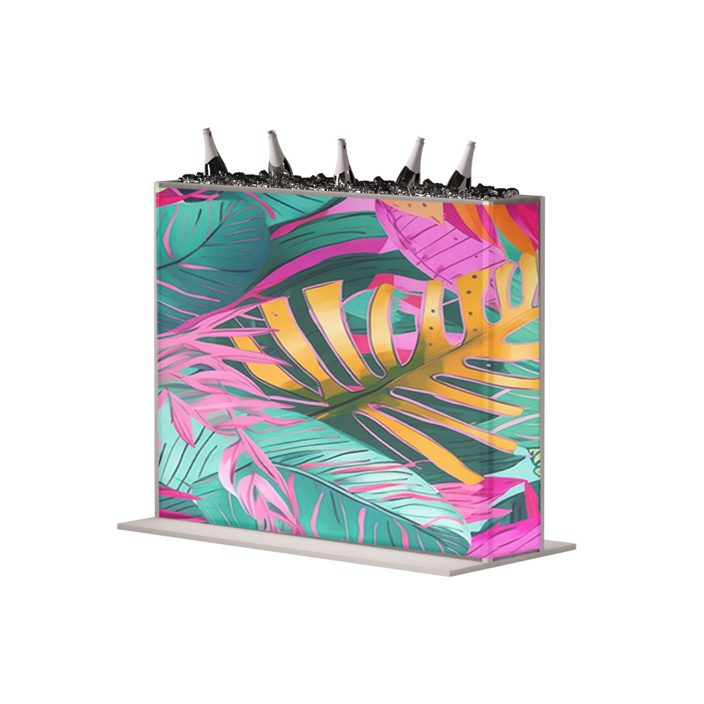 SONJA rendszerünk elemeiből kreatívan építkezhetünk. Lehet hátfal vagy bárpult, TV-vel kiegészülő egyedi térelem, virág- vagy jégtartó, de akár polcos termékbemutató fal. Plexi borítása több színváltozatban rendelhető, teljes felülete 4C print fóliamegoldással egyszerűen brandingelhető. Beltérre ajánljuk.